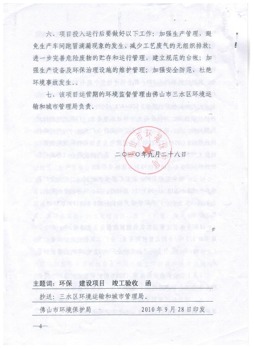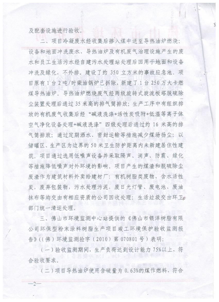 佛环函【2010】 638号----关于佛山市三水银洋树脂有限公司环保型粉末涂料树脂生产项目竣工环境保护验收意见的函